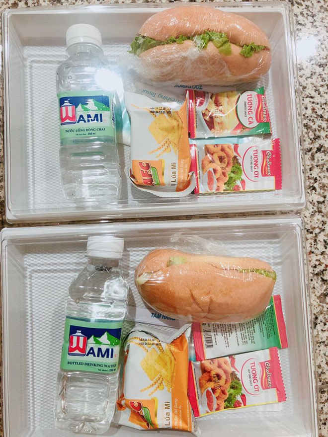 Bữa ăn miễn phí cho hành khách chờ đợi tại sân bay trước khi được đưa đi cách ly theo quy định về phòng chống dịch Covid-19 Ảnh: FB Trang Minh Tran