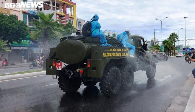 Theo kế hoạch, lực lượng quân đội sẽ phun khử khuẩn tất cả các tuyến đường lớn nhỏ thuộc quận Sơn Trà. Đến 15h, hầu hết các tuyến đường lớn đã được phun khử trùng.