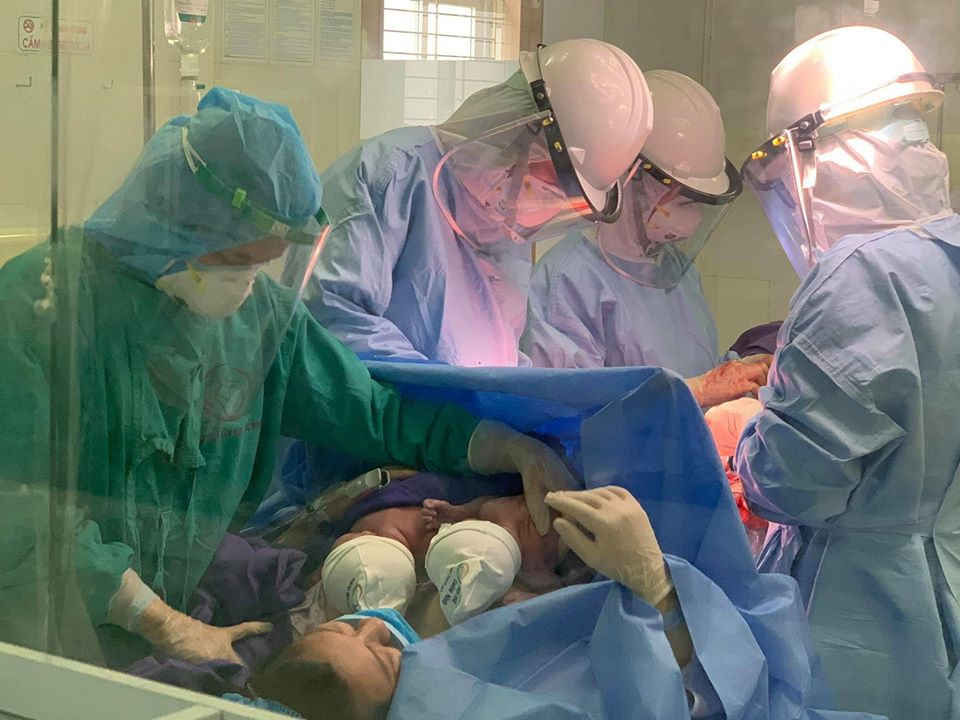 Ngày 8/4, sản phụ có dấu hiệu chuyển dạ nên được chuyển thẳng lên phòng mổ cách ly. Sau 20 phút, nhờ sự trợ giúp của kíp phẫu thuật, chị T. sinh hạ 2 em bé nặng lần lượt 2,8kg và 2,6kg. Hiện sức khoẻ của ba mẹ con ổn định.