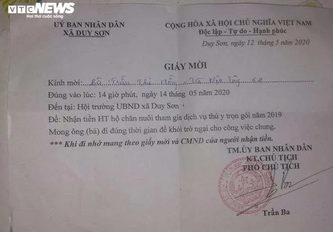 Như VTC News phản ánh, ngày 12/5 vừa qua, UBND xã Duy Sơn gửi giấy mời các hộ chăn nuôi đến nhận tiền hỗ trợ khi tham gia dịch vụ thú y trọn gói năm 2019.