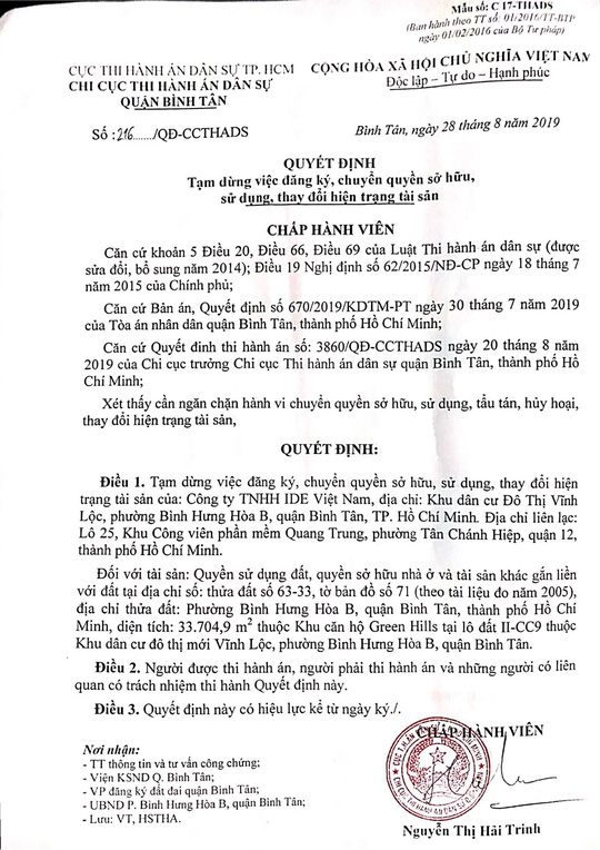 Quyết định của Chi cục Thi hành án về việc tạm ngừng giao dịch, chuyển nhượng tại dự án Green Town Bình Tân.