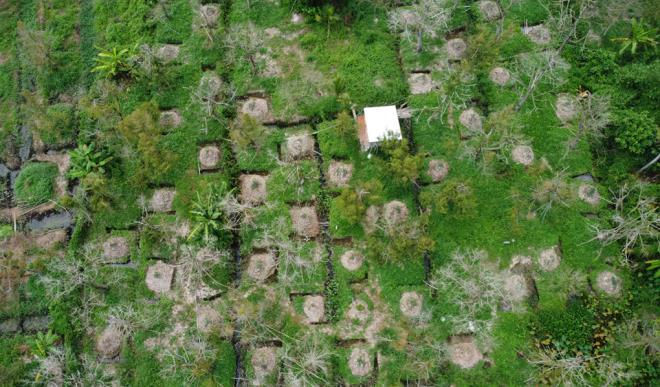 Cùng lúc này năm ngoái, vườn sầu riêng của ông bắt đầu giai đoạn trổ bông, sẽ kịp thu hoạch để gia đình có tiền chơi Tết. Còn năm nay, khu vườn cỏ mọc um tùm vì nhiều ngày không ai chăm sóc. Quanh gốc cây, các đoạn ống nước được tháo rời nằm chỏng chơ. Những mô đất vun quanh gốc khô nứt nẻ, phía trên là thân cây đã chết ngã màu đen xỉn, lá rụng hết, cành bạc trắng, nhiều đoạn mục ruỗng, gãy rơi đầy vườn.