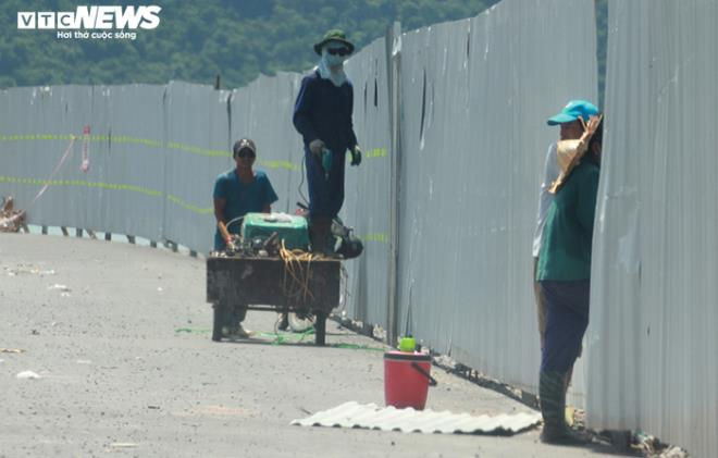 Sáng 13/7, các công nhân đang hoàn thiện hệ thống rào chắn.