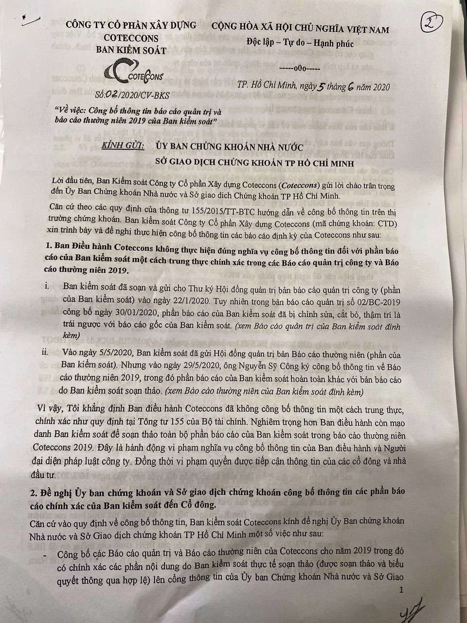 Tiếp đó, ngày 5/5/2020, BKS tiếp tục gửi lên HĐQT báo cáo thường niên về phần của BKS. Tuy nhiên, ngày 29/5/2020, ông Nguyễn Sỹ Công, Tổng Giám đốc Coteccons đã ký công bố thông tin về Báo cáo thường niên năm 2019, trong đó, phần báo cáo của BKS hoàn toàn khác với bản báo cáo do BKS soạn thảo.