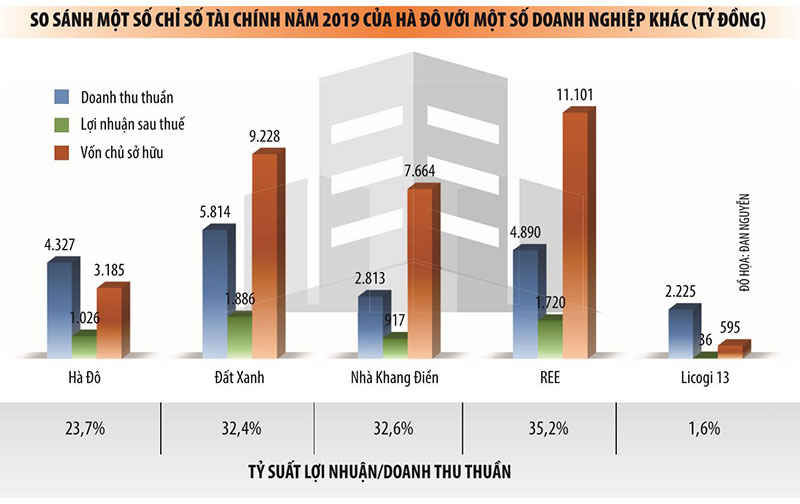 Các chỉ số kinh doanh năm 2019 cho thấy, Hà Đô dù đổ khá nhiều tiền vào ngành điện, nhưng vẫn duy trì được tỷ suất lợi nhuận trên vốn ở mức 32,2%, cao nhất trong 5 công ty được so sánh. Song, thời gian tới, Hà Đô sẽ phải giải bài toán chấp nhận chi phí lãi vay cao khi các dự án đi vào hoạt động. Khi đó chi phí lãi suất các khoản vay sẽ phải tính vào chi phí sản xuất - kinh doanh trong kỳ, thay vì được vốn hóa vào giá trị tài sản trong giai đoạn đầu tư.