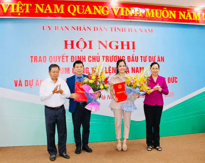 | Ủy viên Trung ương Đảng, Bí thư Tỉnh ủy Hà Nam Lê Thị Thủy cùng Chủ tịch UBND Nguyễn Xuân Đông trao giấy chứng nhận và tặng hoa 2 nhà đầu tư. |