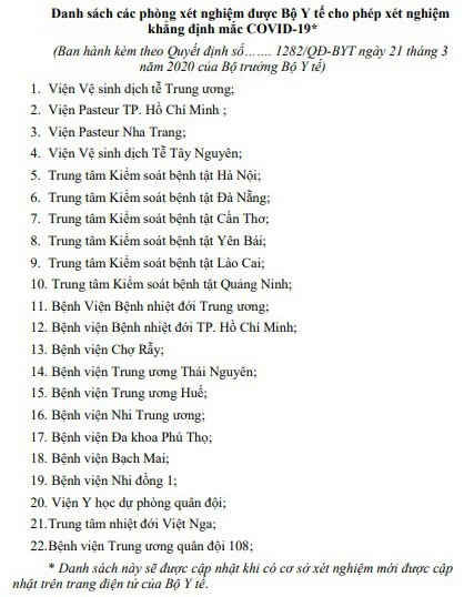 | 22 cơ sở được xét nghiệm khẳng định mắc Covid-19 tại Việt Nam. |