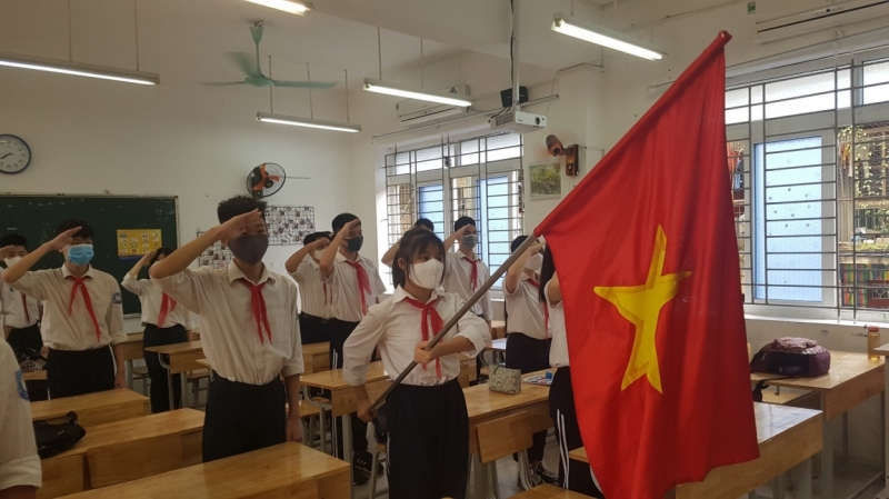 Học sinh thực hiện nghi lễ chào cờ đầu tuần trong lớp họcCác học sinh khi đến trường tự giác đến bàn y tế đo thân nhiệt và rửa tay sát khuẩn