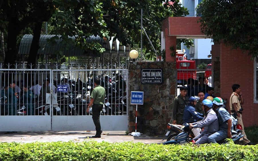 | Các lực lượng chức năng có mặt bảo vệ hiện trường sau khi xảy ra vụ nổ ở Cục Thuế Bình Dương |