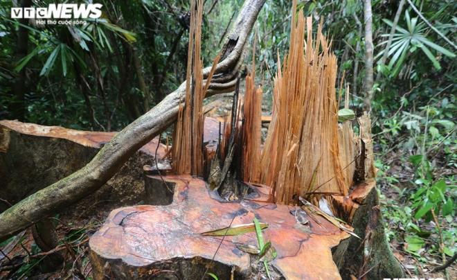 Hàng chục cây cổ thụ ở rừng phòng hộ Sông Tranh thuộc xã Trà Giác bị lâm tặc đốn hạ vào năm 2019.