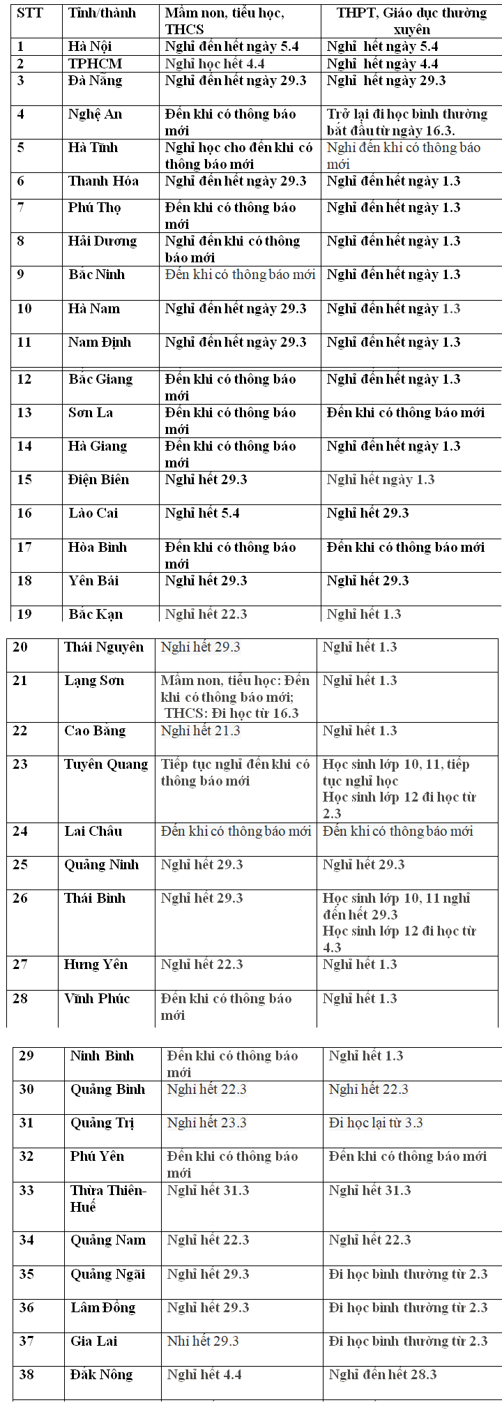 Lao Động cập nhật lịch nghỉ học và đi học trở lại của học sinh trên cả nước (cập nhật đến 20h ngày 20.3):