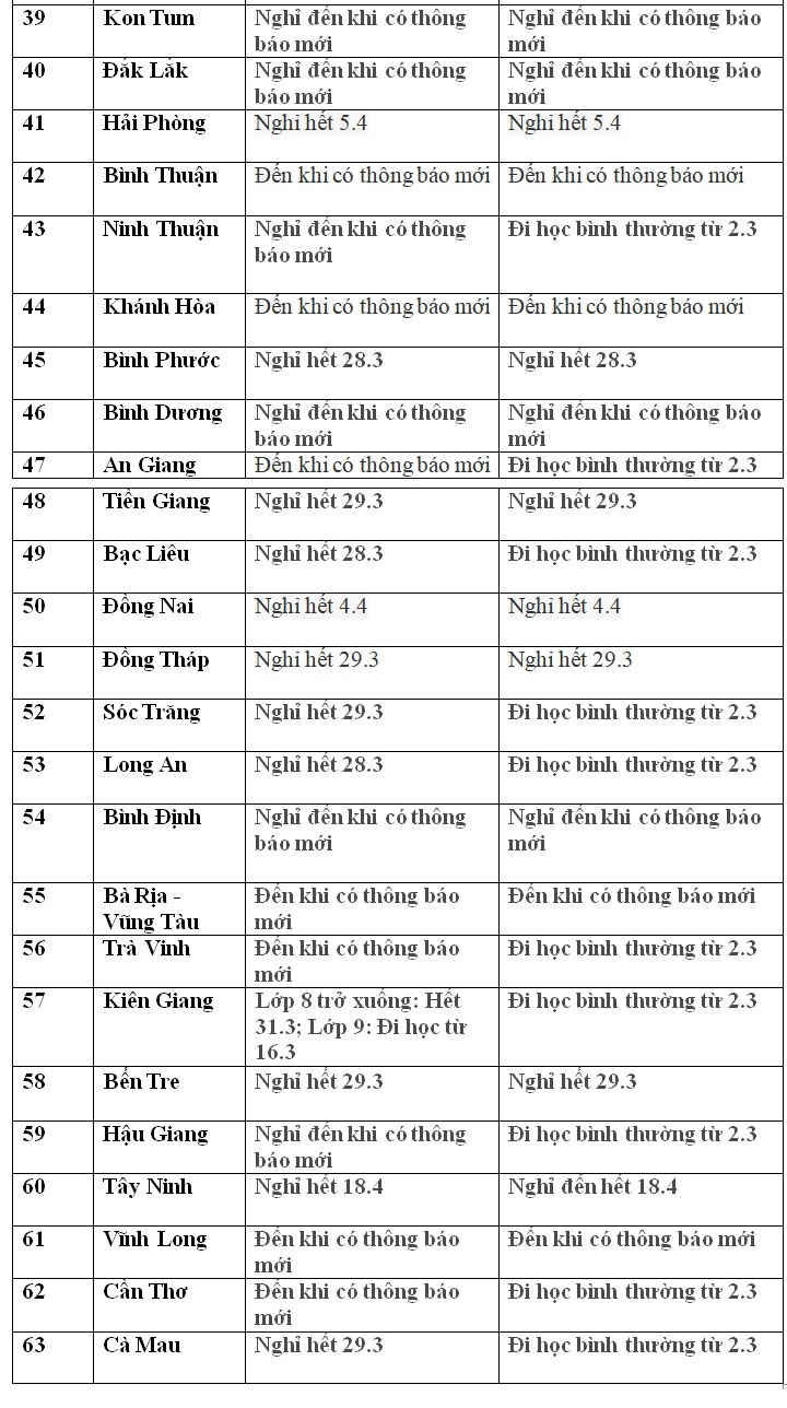 Tại Sóc Trăng: Học sinh mầm non, tiểu học và trung học cơ sở tiếp tục nghỉ từ ngày 23 đến 29.3. Học sinh trung học phổ thông, sinh viên các trường cao đẳng và học viên trung tâm giáo dục thường xuyên học bình thường.