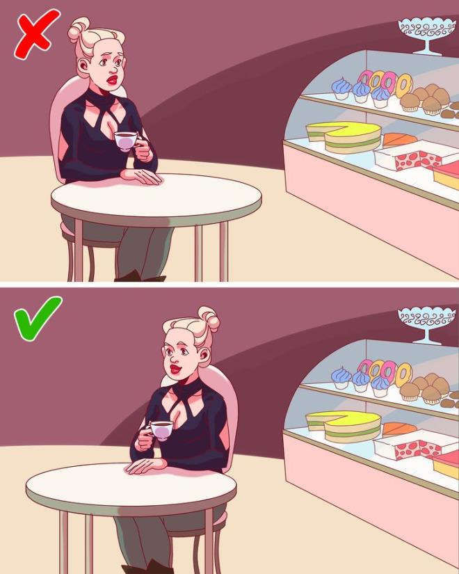 Ngồi đối diện với đồ ăn sẽ khiến kế hoạch giảm cân của bạn bị thất bại. Do vậy, khi vào một cửa hàng có bày đồ ăn trước mặt, bạn nên chọn một vị trí quay lưng lại. Như vậy sẽ không kích thích cảm giác thèm ăn và giúp bạn giảm cân được dễ dàng hơn.
