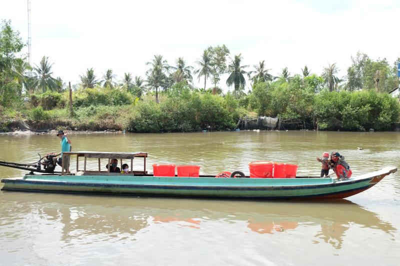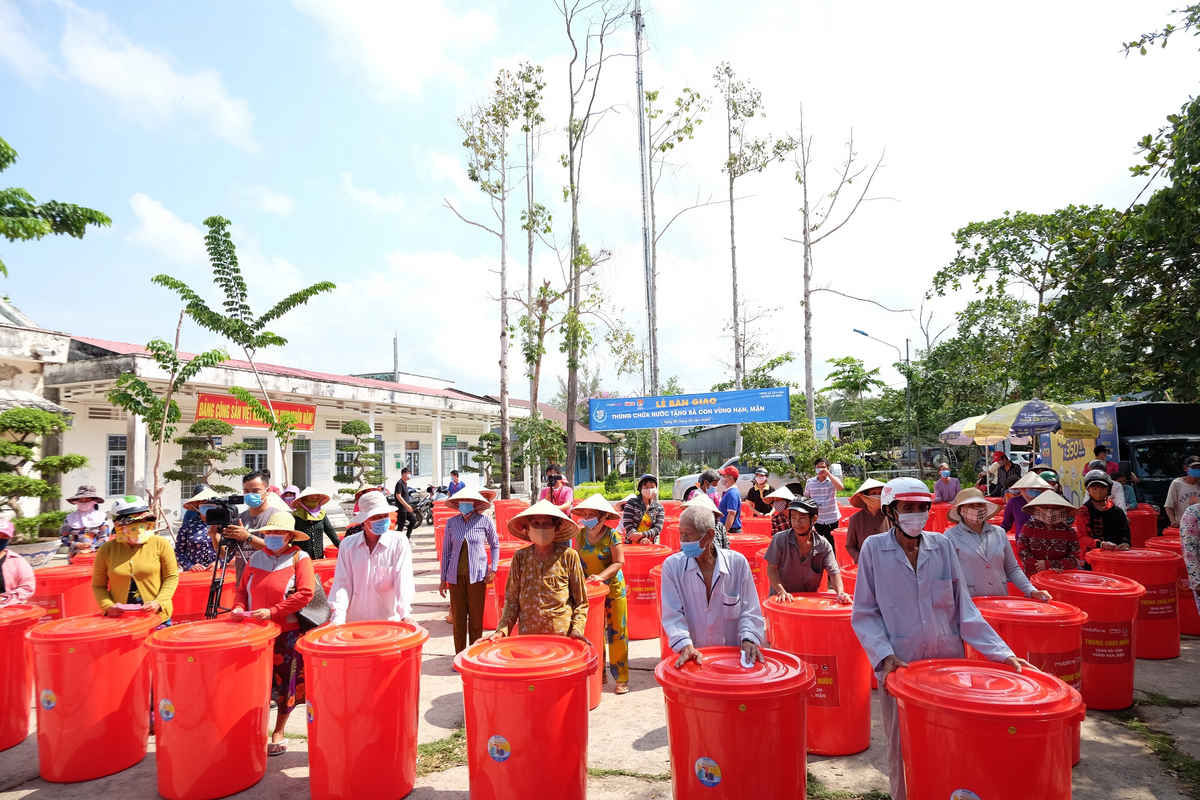 Bà con nông dân huyện Trần Đề, Sóc Trăng nhận thùng chứa nước ngọt