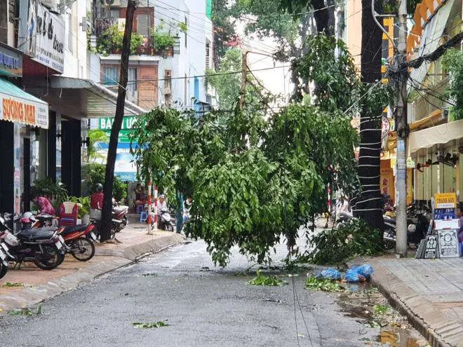 Cơn mưa lớn kèm gió mạnh chiều 10/6 khiến nhiều cây xanh trên nhiều tuyến đường ở TP Cần Thơ bật gốc, gãy nhánh.