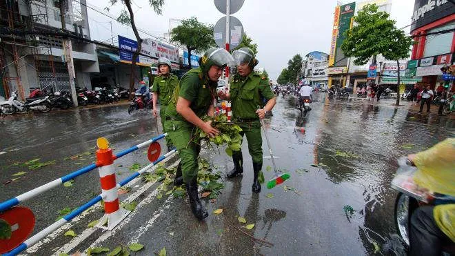 Lực lượng Công an TP Cần Thơ tích cực dọn dẹp đường để các xe lưu thông an toàn.