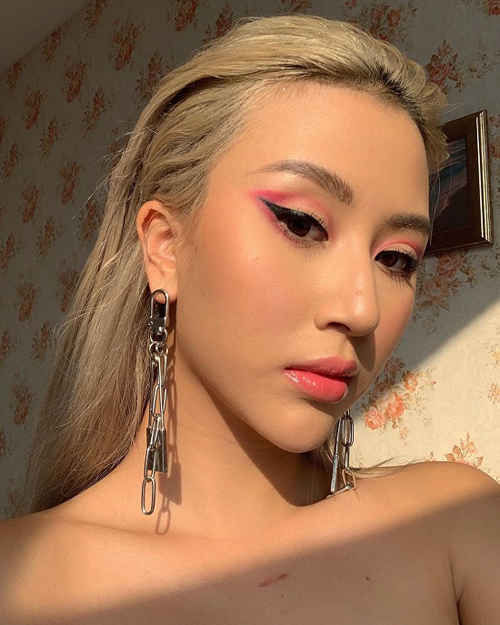 Chi Pu trang điểm mắt hồng neon tông xuyệt tông với trang phục.