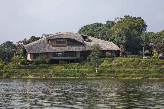 Cốt nền của công trình được nâng cao theo chiều dốc địa hình để tránh mối mọt và ẩm thấp, đồng thời nâng tầm nhìn vào hồ nước cho người bên trong nhà.