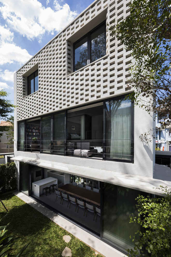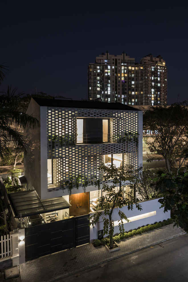 Với mặt tiền là một ngôi nhà 3 tầng, nhưng thực tế bên trong lại có tới 4 mặt sàn, ngôi nhà được các kiến trúc sư của Nha Dan Architects thiết kế với các khối đặc rỗng rõ ràng bên ngoài, kết hợp gạch lỗ giúp thông gió và chiếu sáng.