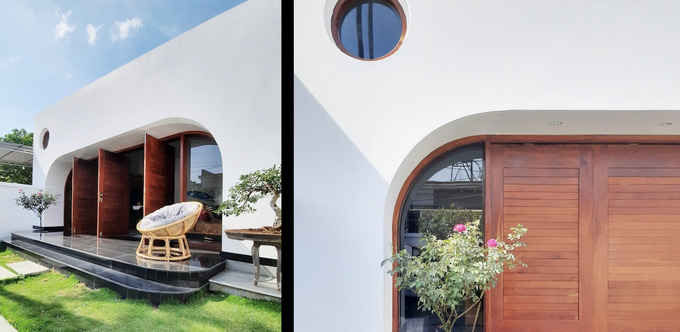 Kết hợp với những đường cong là hình khối đơn giản. Trên mảng tường trắng, màu gỗ của khung cửa tạo nên một nét kiến trúc đơn giản nhưng ấn tượng.