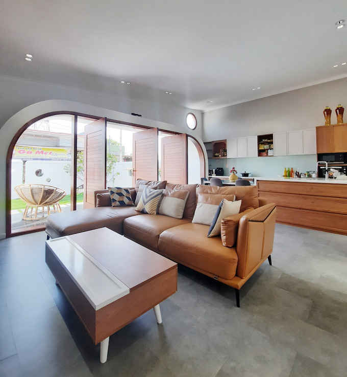 Bên trong, bếp và phòng khách liên thông với nhau. Hệ cửa gỗ - kính cao hơn 2 m và rộng hơn 5 m giúp cả không gian này tràn ánh sáng và gió.