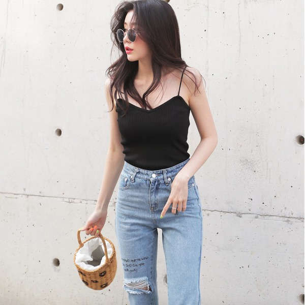 Các quý cô có thể mix áo hai dây với quần jeans theo quy tắc trên hở, dưới kín.
