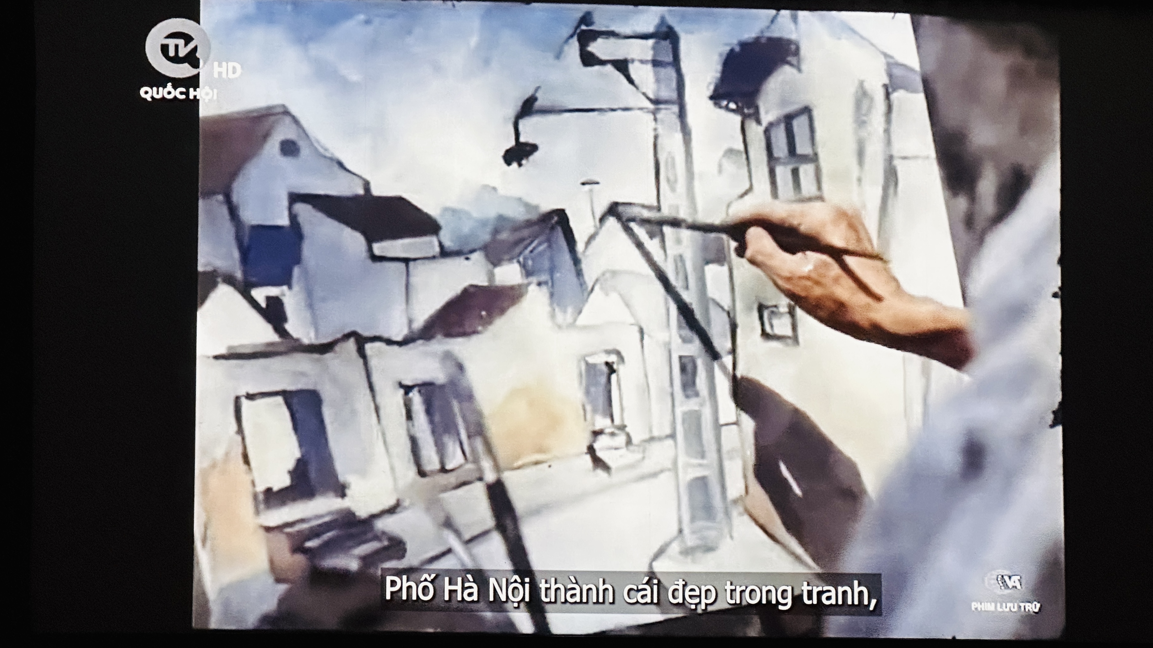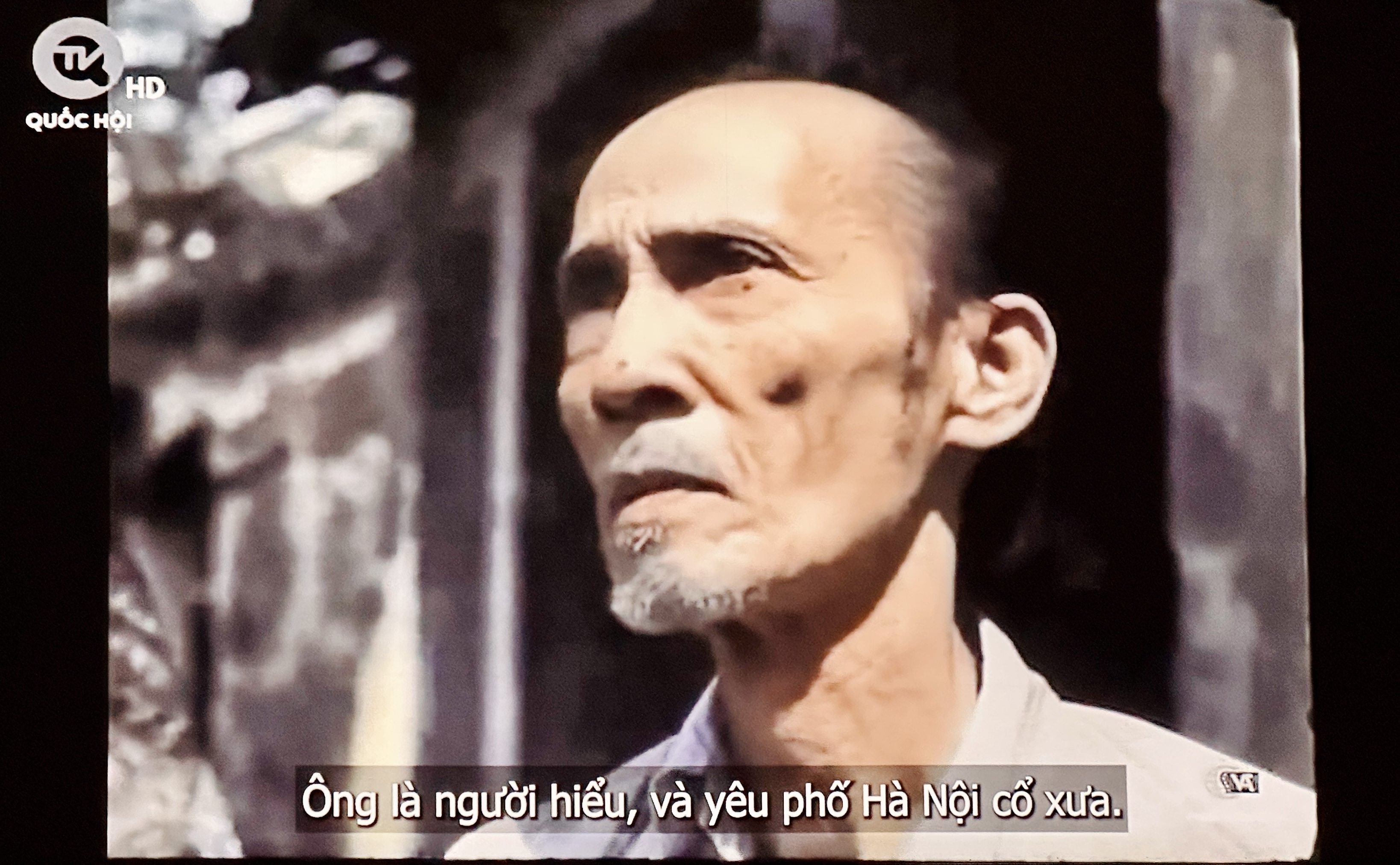 | Khung hình lưu giữ khoảnh khắc họa sĩ Bùi Xuân Phái vẽ tranh trên phố cổ Hà Nội |
