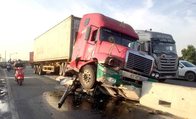 Tại hiện trường, chiếc xe container BKS 63C-057.86 biến dạng phần đầu, dầu nhớt chảy lênh láng. Kế bên là đoạn dải phân cách bị tông đổ cùng một biển báo giao thông gãy rời, văng qua làn đường xe 2 bánh.