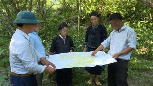 | Bà Tải Thị Seo (áo nâu bên phải) và chị Tải Thị Chúm (áo nâu bên trái) cùng cán bộ Phòng Nông Nghiệp huyện Hoàng Su phì (Hà Giang) xem bản đồ quy hoạch vùng trồng “mận máu”. Ảnh: Nguyễn Chiến-TTXVN |