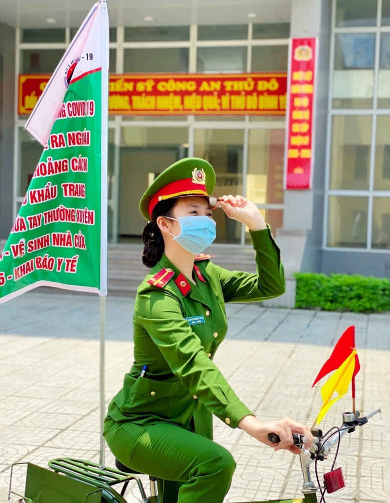 Theo đó, các chiến sĩ cảnh sát đạp xe, tuyên truyền trực quan tới bà con việc thực hiện cách ly xã hội, giữ khoảng cách an toàn, đeo khẩu trang, sát khuẩn tay, khai báo y tế hàng ngày… phòng, chống dịch bệnh Covid-19 đang diễn biến phức tạp.