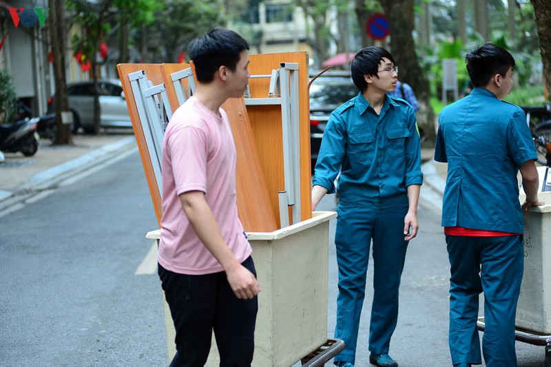 Trong khi đó lực lượng chức năng phường Trúc Bạch thu dọn những vật dụng phục vụ cho công tác cách ly và hỗ trợ người dân.