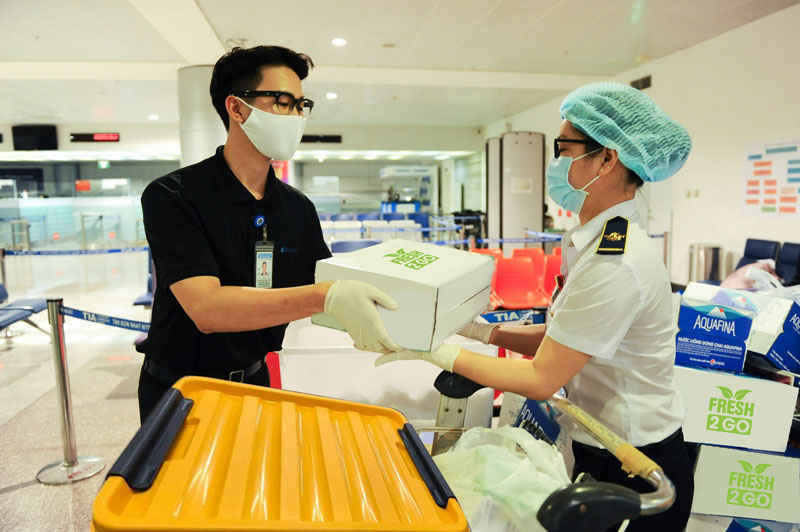 | Nhân viên SASCO ISC vận chuyển suất ăn đến tận nơi cán bộ y tế làm việc tại sân bay Tân Sơn Nhất |