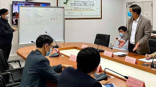 | Cuộc họp giữa các lực lượng tại Trung tâm Khẩn nguy Cảng Hàng không quốc tế Nội Bài tối muộn 18/3. |