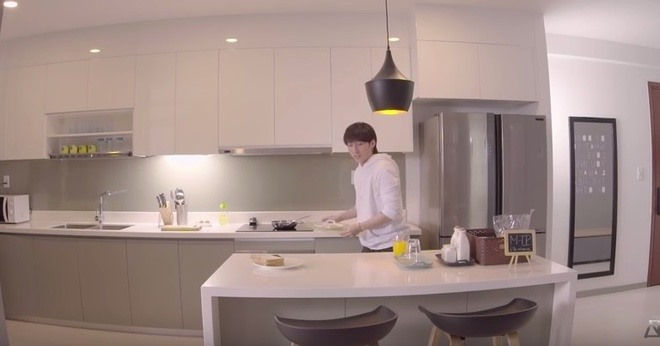 Khu bếp có tông trắng chủ đạo. Đặc biệt, bếp chỉ có những vật dụng cần thiết. Ngoài ra, nam ca sĩ không cầu kì trong cách trang trí nơi nấu nướng của mình.