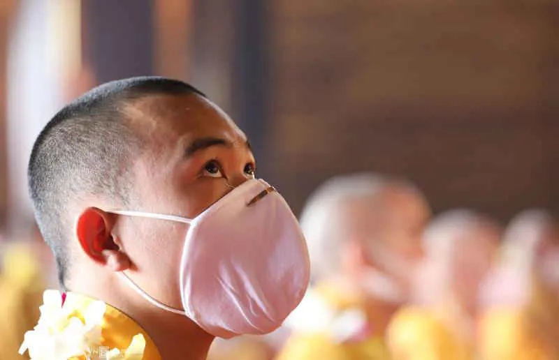 Trước buổi lễ, cán bộ y tế địa phương đo thân nhiệt, kiểm tra y tế những người tham gia. Tất cả phật tử đeo khẩu trang, đứng cách nhau 2m.
