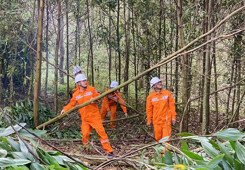 Công nhân Công ty Điện lực Thanh Hóa chặt tỉa cây giải phóng hành lang, đảm bảo an toàn lưới điện. |