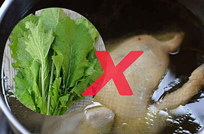 Thịt gà kiêng ăn muối vừng (muối mè, và rau thơm): Thịt gà thuộc về phong mộc, nếu ăn lẫn muối vừng, rau thơm tất động đến can phong mà sinh ra chứng chóng mặt, run rẩy cả người. Nếu chẳng may ăn phải, có các triệu chứng trên thì nấu nước cam thảo uống sẽ khỏi.