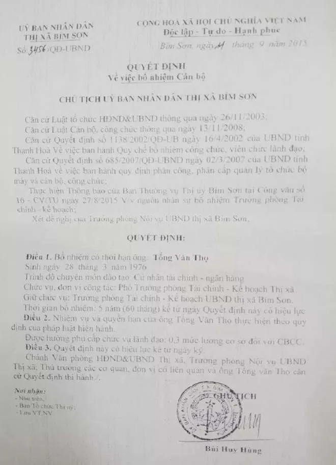 Cụ thể, trong quá trình tuyển dụng đặc cách công chức không qua thi tuyển đối với ông Tống Văn Thọ, UBND tỉnh Thanh Hóa đã không có văn bản báo cáo Bộ Nội vụ. Đặc biệt, khi vừa trở thành công chức không qua thi tuyển chưa "ấm chỗ" (hơn 3 tháng), ngày 4/8/2014, ông Thọ đã được thị xã Bỉm Sơn cất nhắc lên vị trí Phó phòng Tài chính - Kế hoạch. Đến ngày 18/9/2014, ông Bùi Huy Hùng, Chủ tịch UBND thị xã Bỉm Sơn đã có tờ trình xin Thường vụ Thị ủy Bỉm Sơn phê chuẩn bổ nhiệm ông Tống Văn Thọ vào vị trí trên.