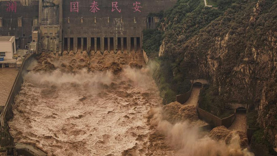 | Đập Tam Môn Hiệp trên sông Hoàng Hà xả lũ ngày 22/8. Ảnh: Chinanews |