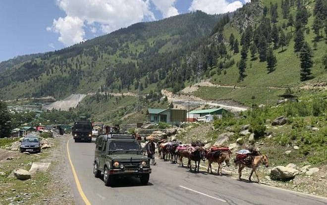 | Đoàn xe của quân đội Ấn Độ di chuyển trên tuyến cao tốc Srinagar-Ladakh hôm 18/6. Ảnh: AP. |