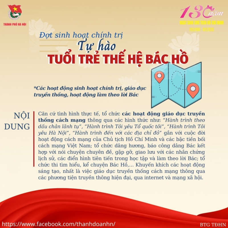 Các cấp bộ Đoàn trong toàn thành phố tổ chức đợt sinh hoạt chính trị với chủ đề “Tự hào tuổi trẻ thế hệ Bác Hồ” (cao điểm từ ngày 14 đến 21/5/2020) với nhiều nội dung ý nghĩa như: Tìm hiểu về thân thế, cuộc đời và sự nghiệp cách mạng vĩ đại của Chủ tịch Hồ Chí Minh; tri ân và tôn vinh những cống hiến vĩ đại của Người đối với sự nghiệp cách mạng của Đảng và dân tộc Việt Nam, với phong trào Cộng sản và Công nhân quốc tế; những kết quả nổi bật trong 5 năm thực hiện Nghị quyết Đại hội Đảng các cấp, Nghị quyết Đại hội Đảng bộ thành phố Hà Nội lần thứ XVI và Nghị quyết Đại hội Đảng lần thứ XII.