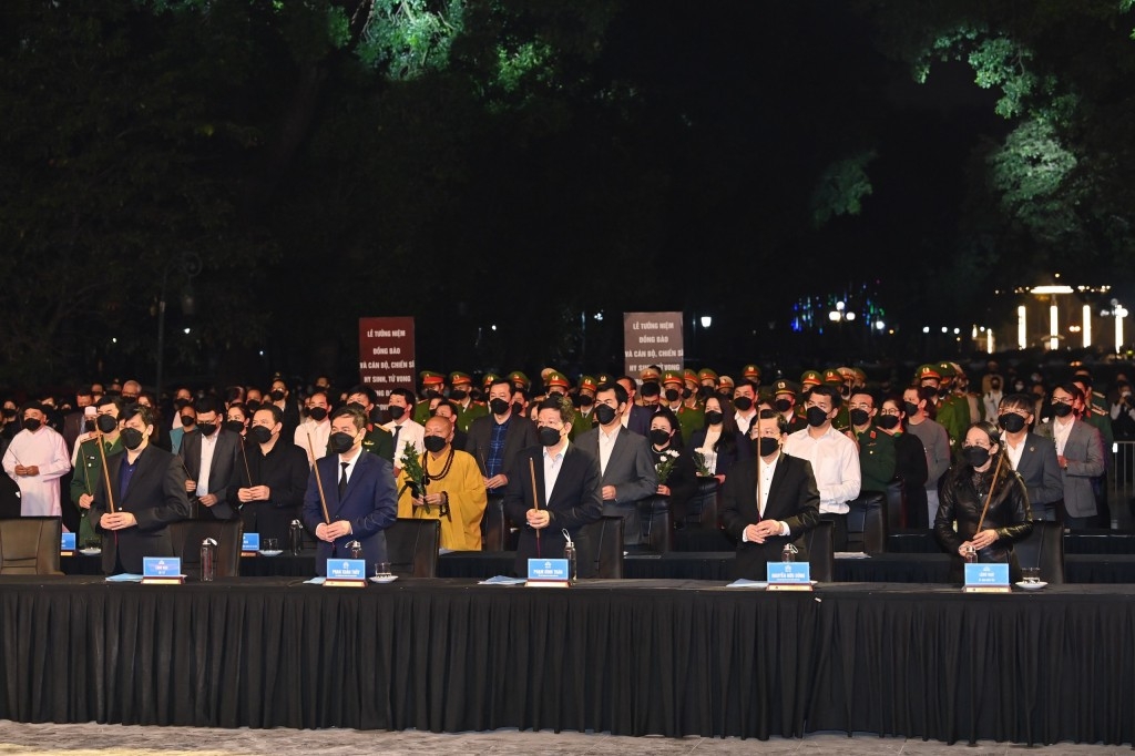 Ngay sau phát biểu, các đồng chí lãnh đạo Đảng, Nhà nước cùng toàn thể người dân cả nước tham dự Lễ tưởng niệm đã dành một phút để tưởng niệm đồng bào và cán bộ, chiến sĩ đã hy sinh, tử vong trong đại dịch Covid-19.