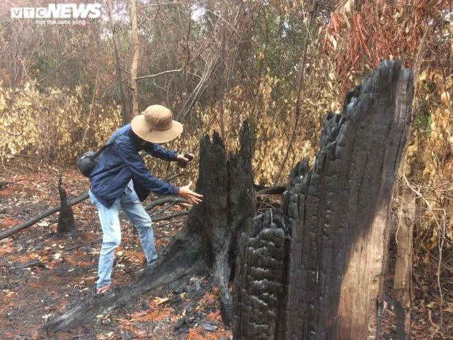 Tại đây, hàng loạt cây rừng từ nhỏ đến lớn đều bị cưa hạ, nhiều thân cây với kích thước lớn còn nằm ngổn ngang. Bên cạnh những gốc mới là nhiều cây cũ đã bị đốn hạ và đốt cháy đen. Ước tính diện tích rừng đã bị ‘cạo trọc’ lên tới hàng nghìn hecta và vẫn chưa có dấu hiệu dừng lại.