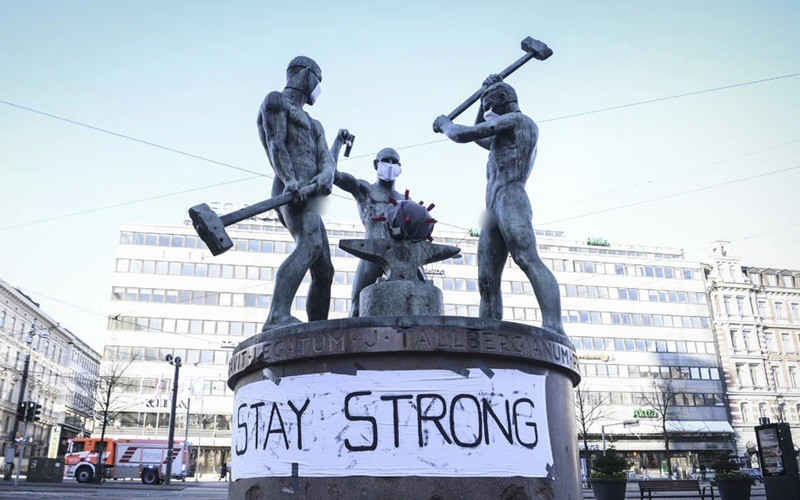 | Tượng thợ rèn được đeo khẩu trang để thể hiện quyết tâm chống Covid-19, ở Phần Lan. Ảnh: EPA. |